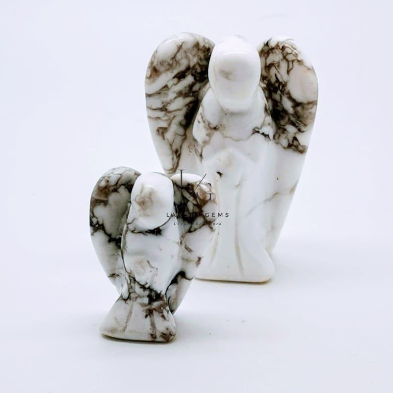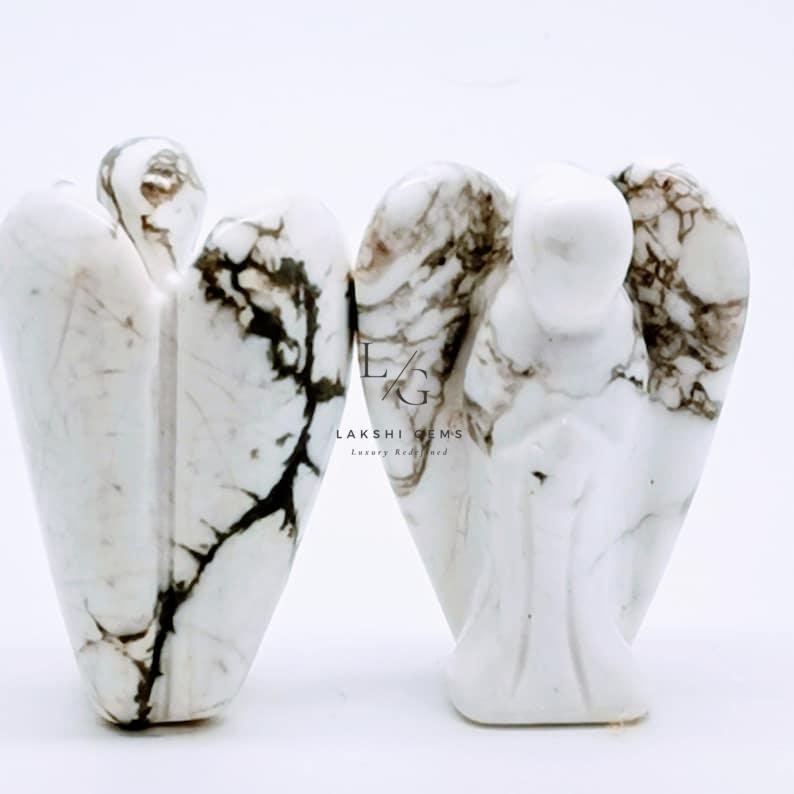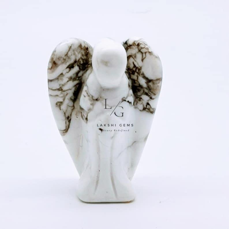 The Howlite Angel embodies tranquility, promoting peace, calmness, and healing energies. It supports relief from migraines, encourages restful sleep, fosters emotional well-being, enhances psychic abilities, nurtures spirituality, and attracts universal guidance and prosperity.